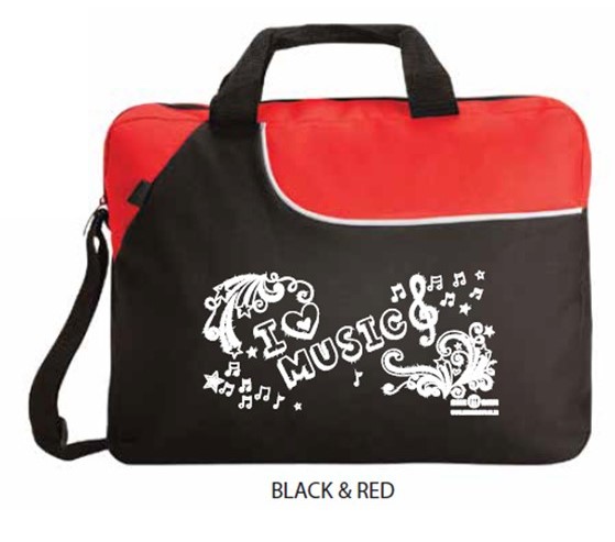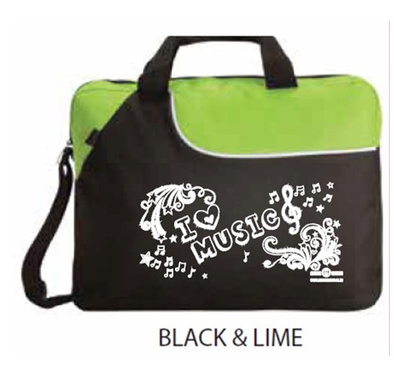 Shoulder bag with zip, black and navy blue, large enough for A4 books, with white ‘I love music’ design.